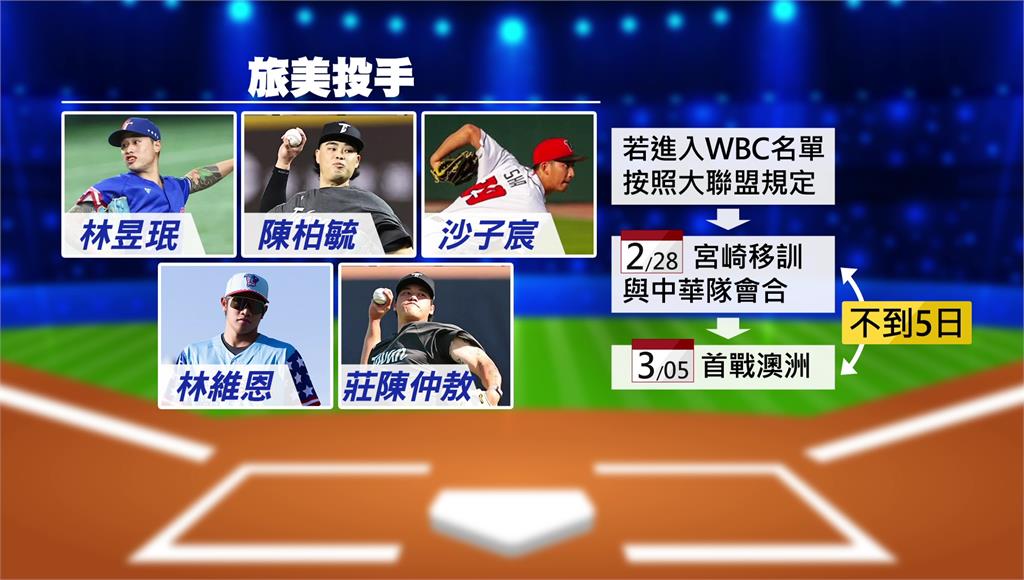 WBC世界棒球經典賽將在3月開打,旅美強投鄧愷威以及台鋼雄鷹投手黃子鵬都婉拒參賽。專家指出,對於欠缺投手戰力的台灣隊而言,恐怕是一大考驗。尤其這回預測名單中的旅美投手,包含陳柏毓、沙子宸、莊陳仲敖等人,可能要到2月28日前往宮崎移訓,才有機會與國家隊會合,距離首戰澳洲僅剩不到五天。