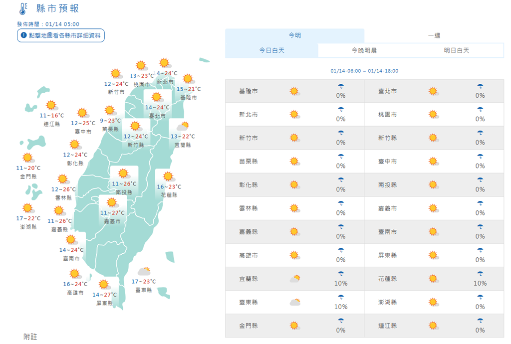 1/14全台天氣預報。圖/中央氣象署天氣方面,環境偏乾,各地大多為晴到多雲的天氣,僅東半部地區及恆春半島有零星短暫雨;東北風偏強,新北、桃園、台中、彰化、台東、恆春半島及澎湖、蘭嶼、綠島局部地區有平均風6級以上或陣風8級以上發生的機率;此外,高山夜間及清晨氣溫偏低,路面易結冰,行車用路及登山客要注意路況安全,山坡地農作物須防範寒害。