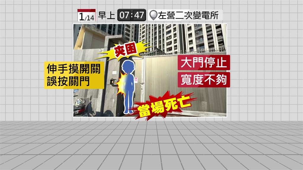 張姓死者是台電左營二次變電所的巡檢班長,今早7點多上班時,一如往常前往開啟大門,把摩托車牽進去之後,再把工程車輛開出來,沒想到開啟大門後疑似觸動紅外線感應機制,大門開啟動作停止,不過寬度不夠,當下張姓班長想伸手按開關,卻誤按到關門,當場遭夾困死亡,台電變電所外緊急拉起封鎖線,警方、鑑識人員到場採證。