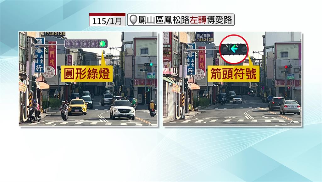 今年1月時,高雄鳳山區鳳松路左轉博愛路的十字路口,交通號誌從「圓形綠燈」,變成箭頭符號,不少當地人早就習慣看到綠燈就轉,但突然更改讓民眾覺得相當突然,完全不知道自己違規,大批騎士猶如進網的小魚,一一被警方攔下。