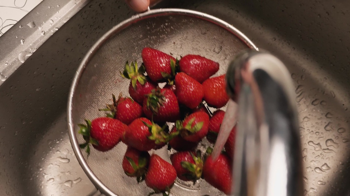 把草莓放進濾網,用清水甩洗2次,再用細水溢流約10分鐘