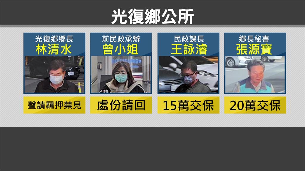 檢方在14號帶回4人,依過失致死、公務員登載不實公文書等罪嫌偵辦,經數小時訊問後,光復鄉公所前民政承辦曾小姐請回、限制住居出境出海,民政課長王詠濬15萬元交保,鄉長秘書張源寶20萬元交保,至於鄉長林清水則遭檢方聲押。