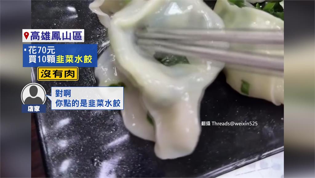 有民眾到高雄鳳山一家蒸餃店,購買韭菜水餃,用筷子把韭菜水餃剝開,裡面韭菜的確包好包滿,但水餃裡面該有的肉卻不見蹤影。向店家反映,老闆卻回「對啊,你點的是韭菜水餃」,讓民眾無奈直呼,根本是「年度踩雷王」、「要不要去搶比較快」。