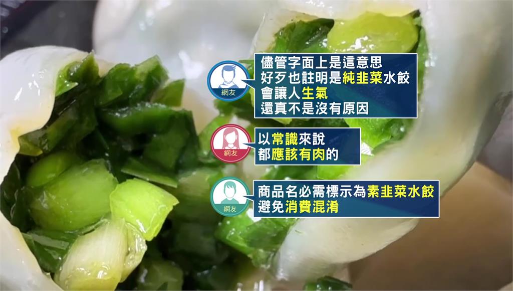 店家指出只特別標記有肉的品項,沒肉的就沒特別提,但這狀況與大眾認知不一,難免引發爭議,店家最好還是清楚註明,「純韭菜」素水餃,避免再發生相同的誤會。