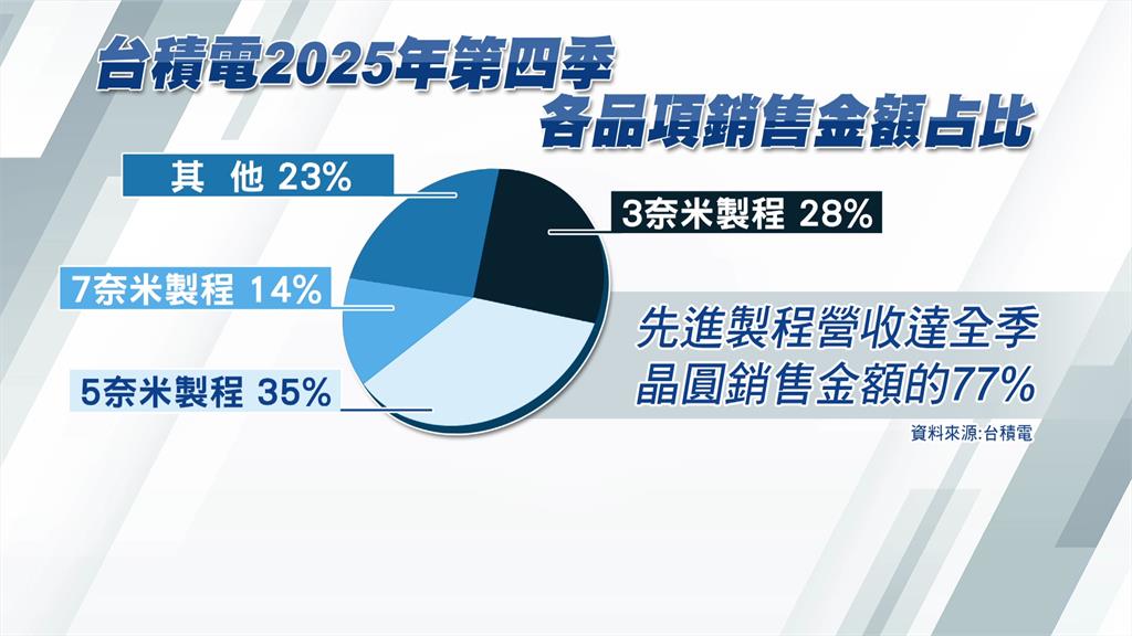 而分析各品項獲利占比,3奈米和5奈米製程分別達到28%和35%,7奈米以下先進製程占晶圓銷售的77%,顯示客戶對台積電先進製程需求持續強勁。