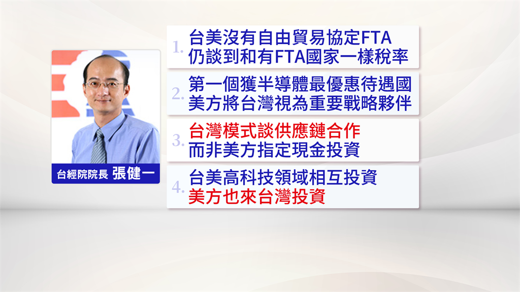 專家憂心擴大投資美國對台灣會有衝擊,也點出台灣對美採購金額包括農產品和軍購,也還沒說明,但台經院院長張建一則樂觀看待,表示台美沒有簽訂自由貿易協定FTA,還能談到15%很不容易,而成為第一個獲得半導體最優惠待遇國也有重要意義。
