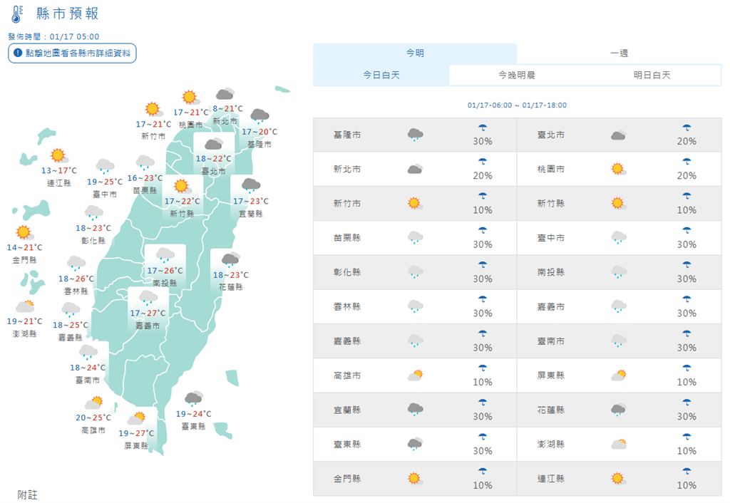 氣象署指出,今天新竹以南為多雲到晴的天氣,溫度方面,各地低溫普遍在16至19度,白天北部、東半部高溫約22至24度,中南部高溫來到24至27度;離島天氣,澎湖多雲時晴19至21度,金門晴時多雲14至21度,馬祖晴時多雲13至17度。