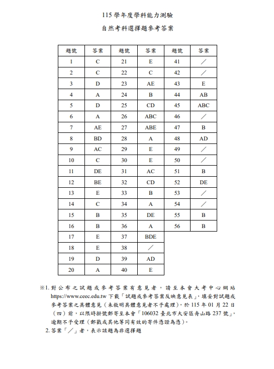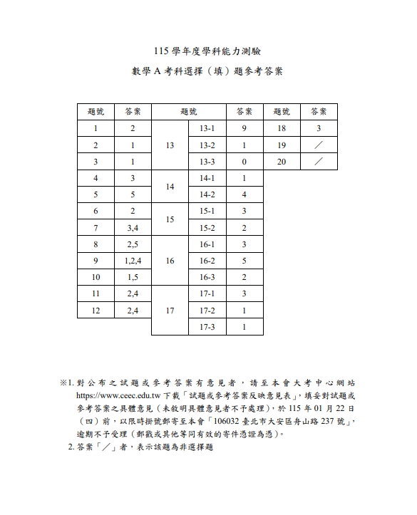 115學年學測今(18)日進入第二天,今年約有12.1萬人報名。晚間大考中心也率先公布學測數A及自然科參考解答,並指出對於試題或參考答案有意見者,可於大考中心官網下載意見表,填妥後以限時掛號郵寄到大考中心,逾期不受理。