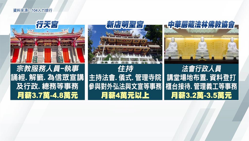 行天宮執事師兄解釋工作內容。圖/台視新聞再看看其他宮廟類似職缺,除了行天宮執事人員月薪最高開到4.8萬;新店明聖宮徵住持,要主持法會儀式、宣揚弘法,開出4萬元以上的月薪;佛教協會徵法會行政人員,要負責資料登打、櫃台接待等,開出最高3.5萬元月薪。