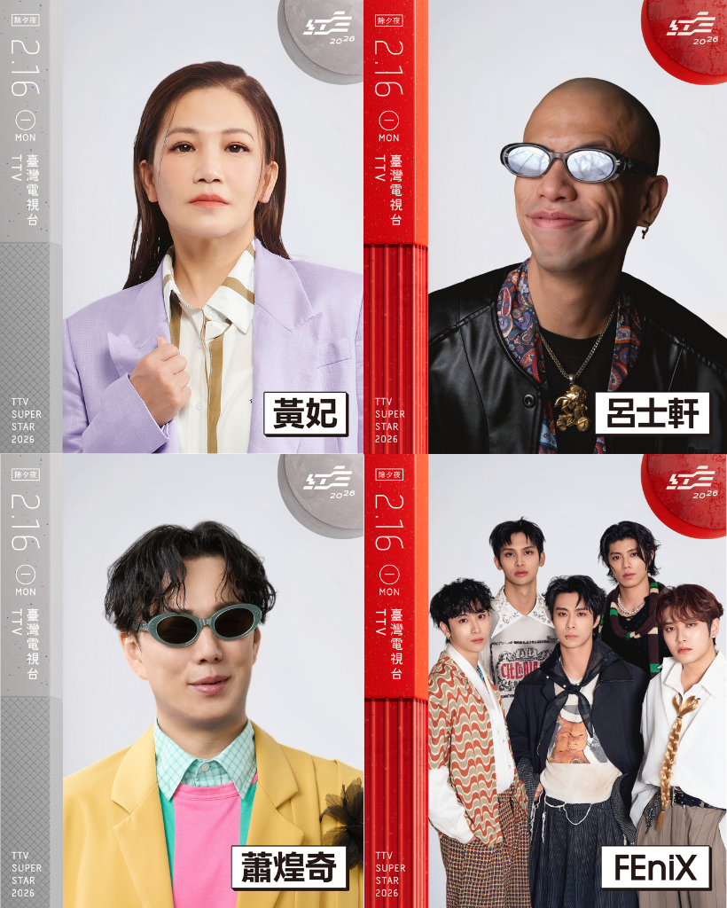 《2026超級巨星紅白藝能大賞》重量級演出陣容華麗公開,集結「樂壇傳奇」比莉、「情歌天后」龍千玉、「台灣歌姬」黃妃,以及選秀節目出道的新生代實力派男團 FEniX、 U:NUS、F.F.O,同時邀來「神曲製造機」八三夭、「R&B 新天王」J.Sheon、「全方位藝人」蕭景鴻(阿弟)、「實力歌手」辛龍、「重量級音樂教父」蔣三省、「流浪歌王」李炳輝等實力派音樂人同台演出。此外,多位金曲獎得主也將齊聚舞台,包括「台語歌王」蕭煌奇、「三金天王」盧廣仲、「嘻哈創作歌手」呂士軒,以及「台語小王子」許富凱,橫跨世代與曲風,打造最具代表性的音樂盛會。