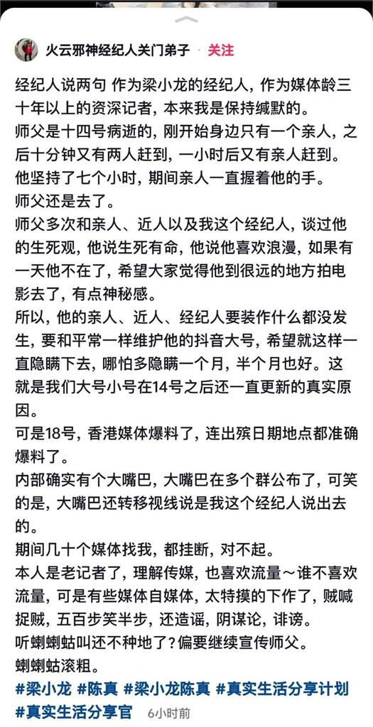 話鋒一轉,經紀人無奈表示,18號有香港媒體爆料了梁小龍死訊,連出殯日期地點都準確爆料了。他透露內部確實有個大嘴巴,這位大嘴巴在多個群組公佈了,甚至大嘴巴還說是經紀人說出去的。由於這名經紀人曾是資深記者,他痛批,「理解傳媒喜歡流量,但造謠誹謗實在太下作了!」原先想保持緘默,決定特別發聲。
