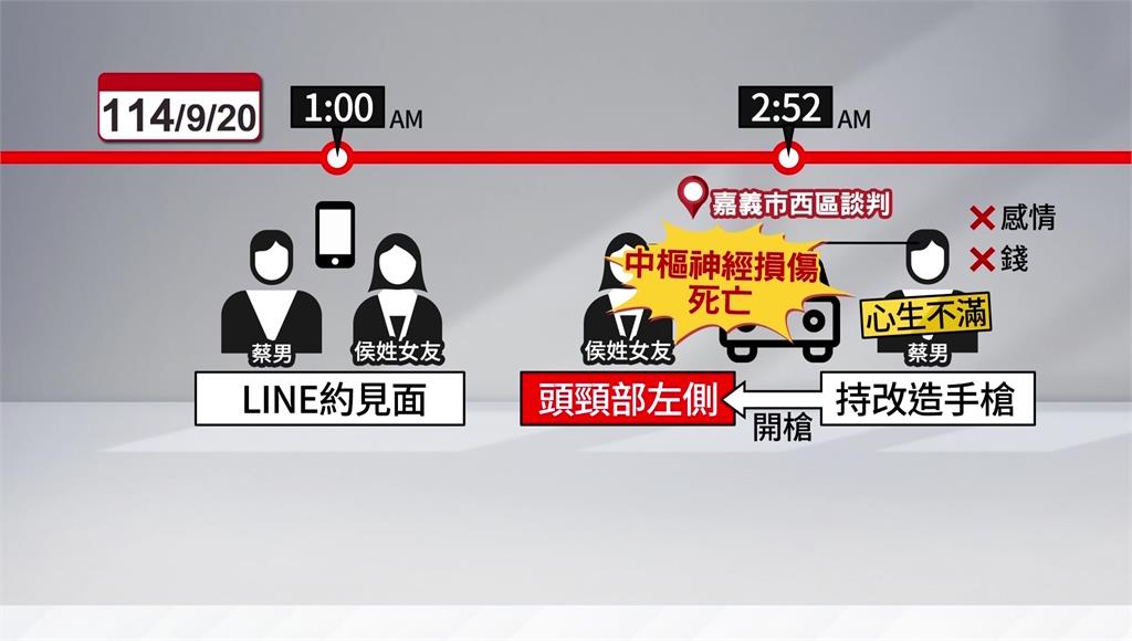 去年9月底,駕駛59歲蔡姓男子和先前同居的女友因感情糾紛,凌晨相約一同前往嘉義市西區談判,因挽回不了感情、錢又討不回,蔡姓男子竟然持改造手槍近距離朝女友頭部左側開槍,女友當場傷重死亡。