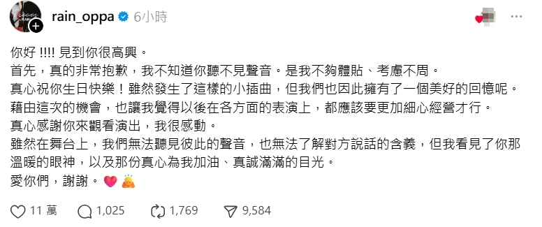 當事粉絲也馬上回應,要Rain別感到抱歉,「能被你欽點是我最棒的生日禮物,真心覺得當你的粉絲好幸福,因為你善良體貼又溫暖,也謝謝粉絲們都那麼熱心為我們這些聽障朋友轉傳,而你的舞台魅力就算是聽不懂也想去感受的」。