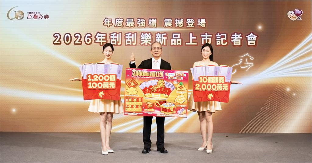 台灣彩券公司今(20)日推出5款刮刮樂新品,最受矚目的新春限定年度最高頭獎「2,000萬超級紅包」,每張售價新臺幣2,000元,頭獎2,000萬元共有10個,100萬元多達1,200個,總獎金逾172億元,總獎項超過797萬個,均是史上最多。