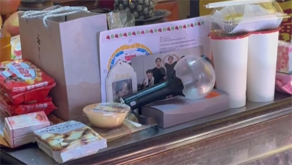 月老廟內香火鼎盛,但這供品卻不是常見的甜點,而是偶像周邊,迷妹們獻上男團桌曆、成員小卡及生日,還有演唱會資訊與座位圖、想搶到的門票細節等。除了周邊外,迷妹們也沒忘了月老最愛的甜食,包裝上也同樣寫滿搶票成功的願望。