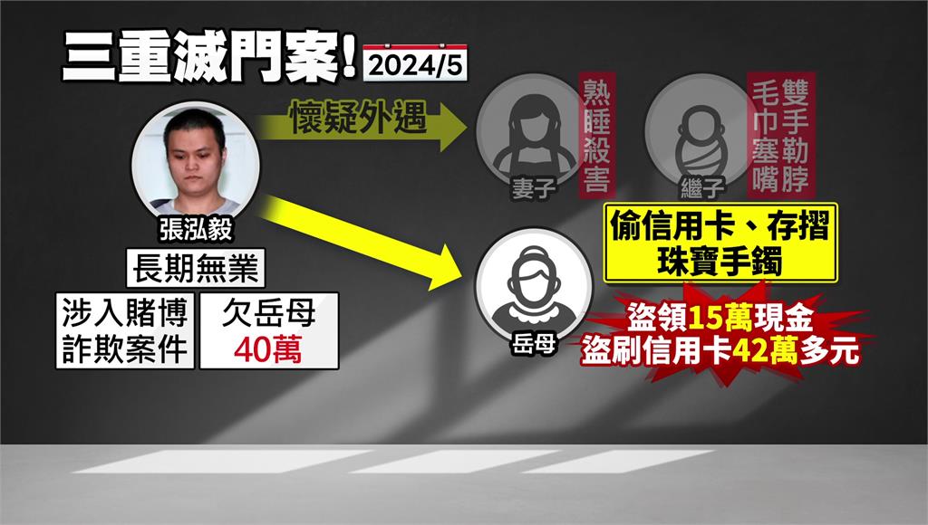還原兇嫌張泓毅犯案過程,他長期沒工作全靠老婆養,且因涉及賭博詐欺案件欠下賭債,更向岳母借了40萬元。2024年5月時,他懷疑妻子外遇,一氣之下,趁妻子熟睡時用枕頭把人活活悶死,隔天凌晨還將岳母勒斃,最後認為三歲的繼子是逃亡時的累贅,竟也將他狠心殺害。