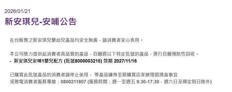 新安琪兒進行自願預防性回收。圖/翻攝自新安琪兒官網責任編輯/網路中心