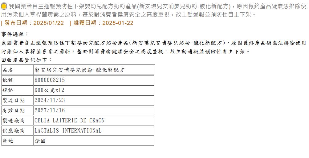法國乳製品龍頭拉克塔利斯集團(Lactalis)21日發布緊急聲明,旗下多款嬰兒奶粉疑似原料遭受「仙人掌桿菌毒素」污染,全球18個國家包括台灣展開預防性回收。而我國食藥署也公告,「新安琪兒安哺嬰兒奶粉-酸化新配方」無法排除使用原料污染仙人掌桿菌毒素,業者主動通報並預防性自主下架。