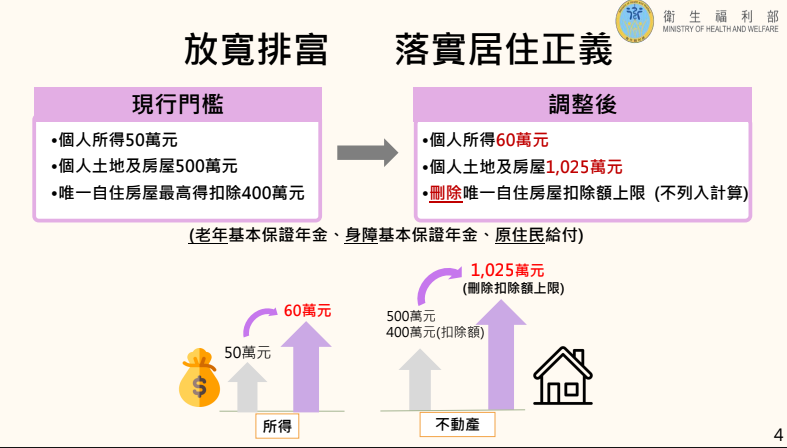 此次修正也放寬不動產及所得門檻。圖/衛福部提供