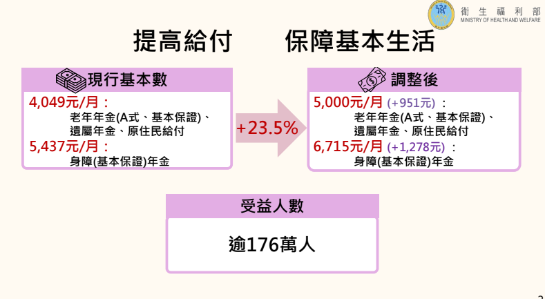 老年年金、遺屬年金及原民給付將上調為每月 5,000 元,身心障礙年金則上調為每月6,715元。圖/衛福部提供提高給付方面,修法後,老年年金、遺屬年金及原民給付將從每月4049元,上調至每月5,000 元,身障基本保證年金則從每月5437元調升至每月6715元,成長幅度達 23.5%,預計有176萬人受益。