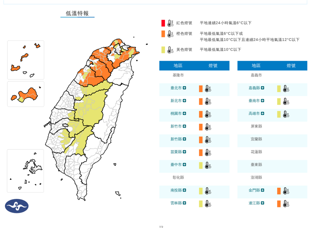 低溫特報。圖/翻攝自中央氣象署責任編輯/蔡尚晉