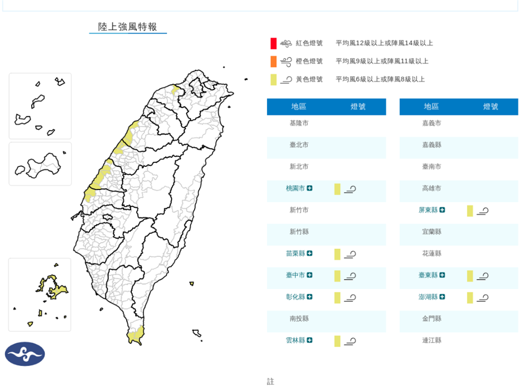 路上強風特報。圖/翻攝自中央氣象署此外,受強烈大陸冷氣團影響,22日至23日上午,全台氣溫偏低,新北市、台北市、桃園市、新竹市、新竹縣、苗栗縣及金門縣有氣溫持續約10度左右,連江則約6度或以下(橙色燈號)發生的機率高;台中市、南投縣、雲林縣、嘉義縣、台南市及高雄市氣溫可能降至10度以下(黃色燈號),提醒民眾注意保暖並防範寒冷與強風影響。