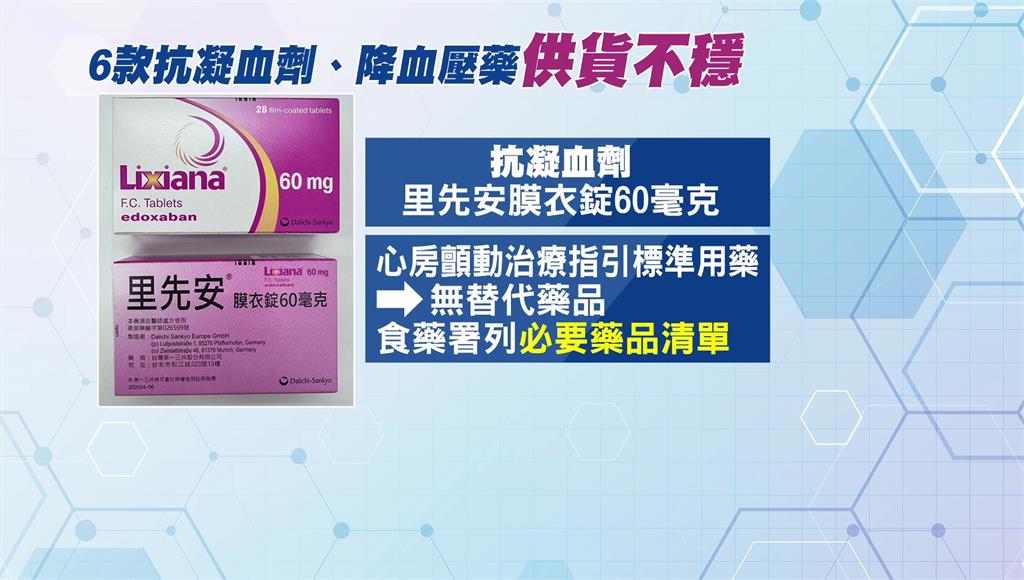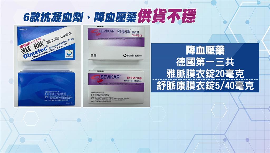 抗凝血劑供貨不穩。圖/台視新聞製圖另外,降血壓藥「德國第一三共雅脈膜衣錠20毫克」及「舒脈優膜衣錠」雖有替代藥品,但醫師評估,受影響患者可能超過50萬人。