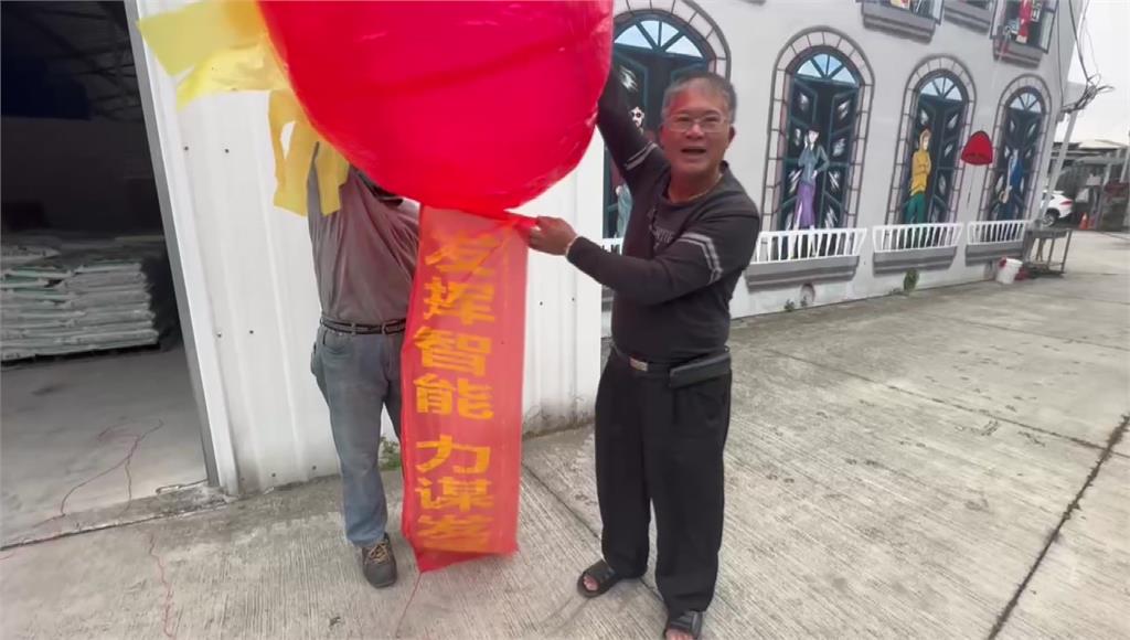 彰化一名駕駛今天上午開車經過彰化市彰南路時,在轉彎處險些撞上一顆直徑約有100公分的巨大紅色氣球,當時因為天才剛亮,民眾一度以為是人影,嚇了一跳,但仔細一看是氣球,加上底下掛著長160公分、寬40公分簡字標語,寫著「發揮智能、力謀發展」8個大字,讓他懷疑從大陸飄過來。