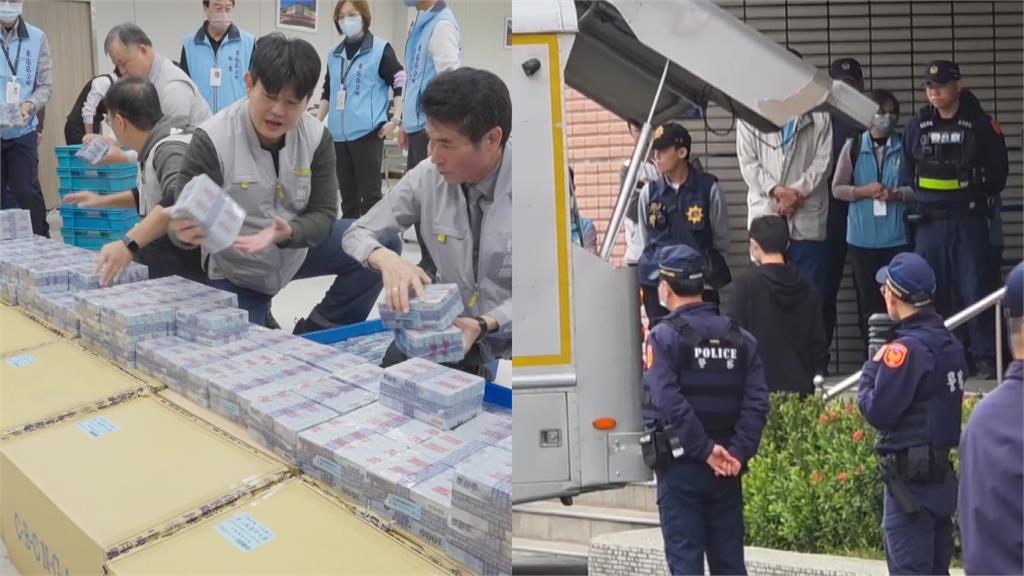 場工作人員逐疊清點紙鈔並由荷槍實彈的員警戒備。圖/台視新聞加碼普發振興經濟! 年滿65歲1/24-25可多領千元