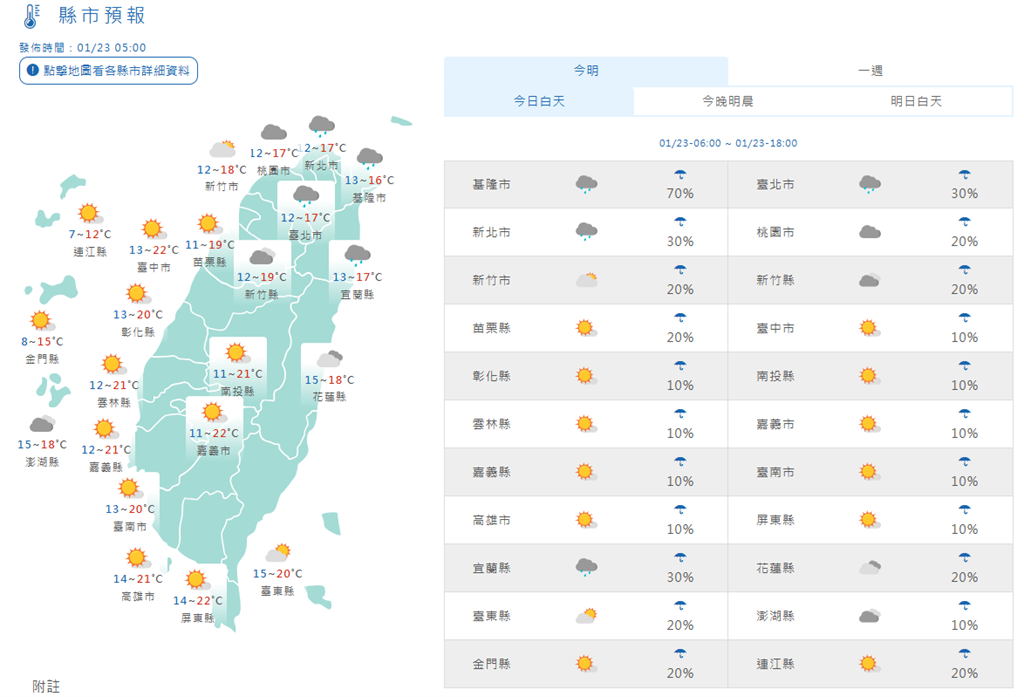 1/23全台天氣預報。圖/中央氣象署氣象署進一步說明,今天白天開始冷氣團逐漸減弱,白天氣溫回升,但「早晚冷」感覺仍明顯,尤其是中南部日夜溫差大,迎風面北部、東部降雨也逐漸減少,清晨中部3000公尺以上、北部東北部2000公尺以上高山仍有降雪機會。