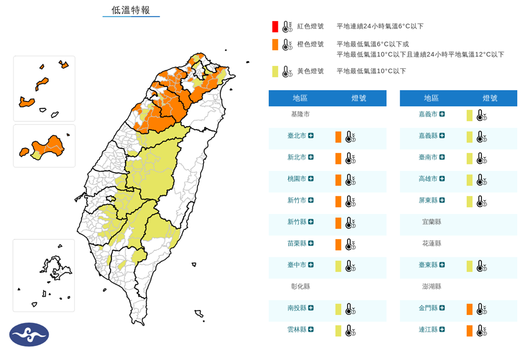 氣象署針對17縣市發布低溫特報。圖/中央氣象署天氣方面,基隆北海岸、大台北山區、東半部地區及恆春半島有局部短暫雨,清晨至上午大台北地區有零星短暫雨,其他地區以多雲到晴的天氣為主;東北風偏強,桃園、苗栗至彰化、恆春半島及澎湖、綠島局部地區有平均風6級以上或陣風8級以上發生的機率,沿海風浪偏大。