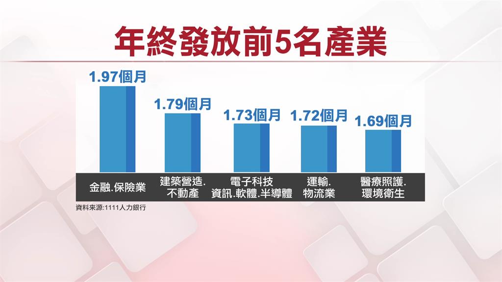 據人力銀行統計,今年有6成5的企業都將發放年終,前五名以金融保險業平均1.97個月居冠,另外像是建築營造、不動產以及電子產業的年終表現,平均也都超過1.7個月,再加上績效獎金及分紅,數字更可觀。