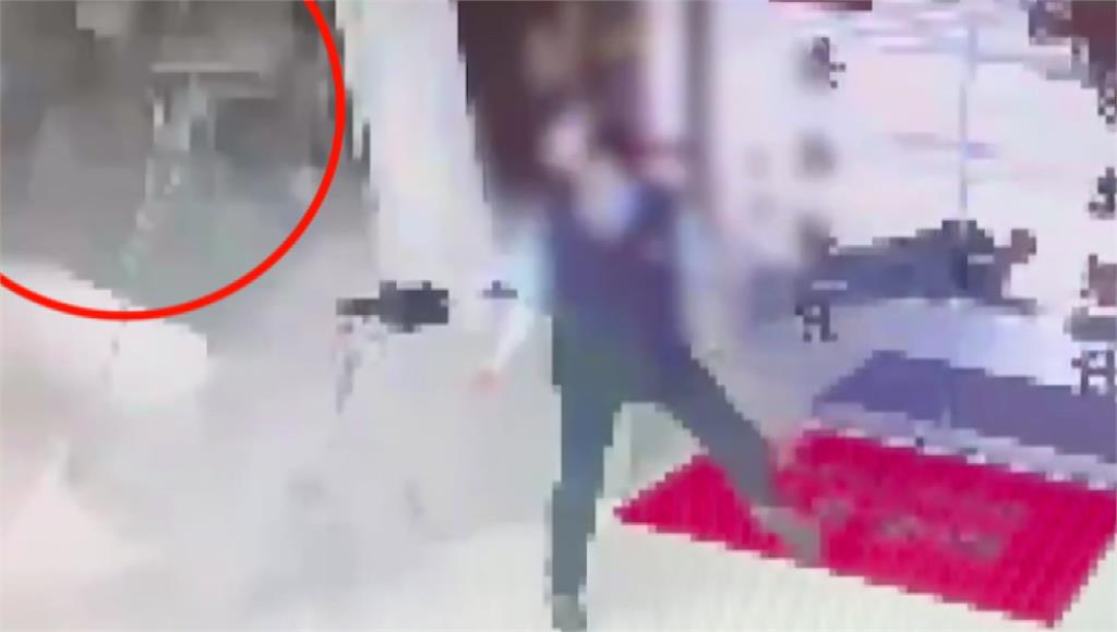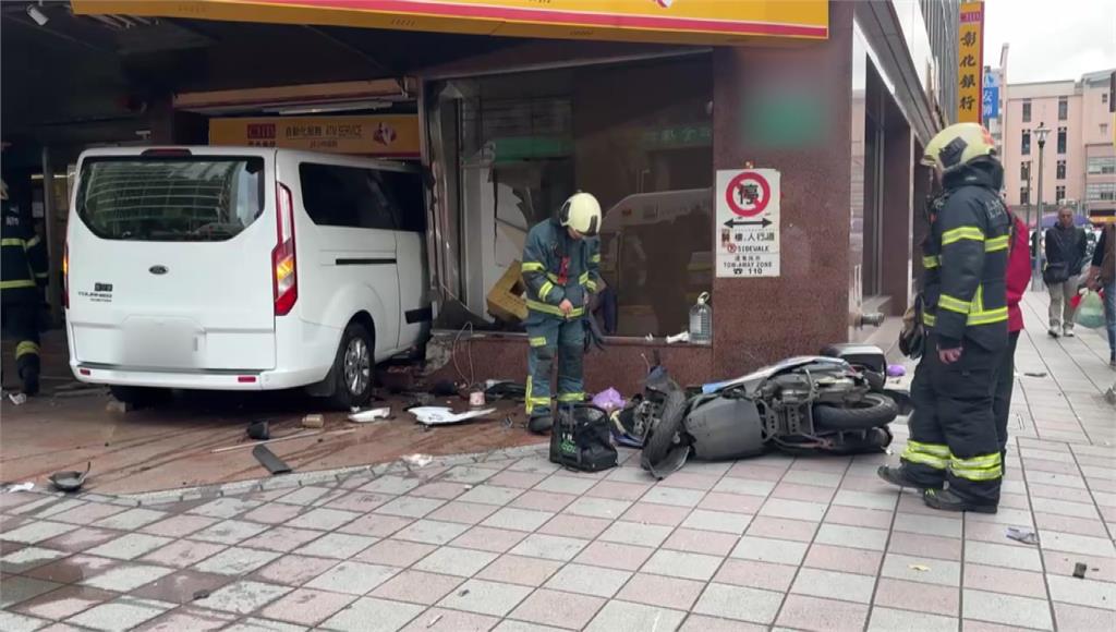 採訪車突然高速衝入,銀行警衛緊急跳開。圖/台視新聞猛力的撞擊力道,導致銀行整面落地窗碎裂,磚牆慘被撞穿,提款機也倒得歪七扭八,營業大廳變成斷垣殘壁;一輛機車連人帶車被撞進騎樓,正要路過的民眾也被撞飛,倒臥在銀行門口,留下大片血跡。