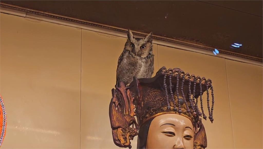 貓頭鷹站在媽祖頭冠上。圖/台視新聞民眾到勸化堂參拜,媽祖神像慈祥又莊嚴,正當點香向媽祖稟報時發現,媽祖頭冠上怎麼怪怪的,仔細看,原來是一隻活生生的貓頭鷹,就站在媽祖頭冠上,兩個眼睛盯著信徒看。