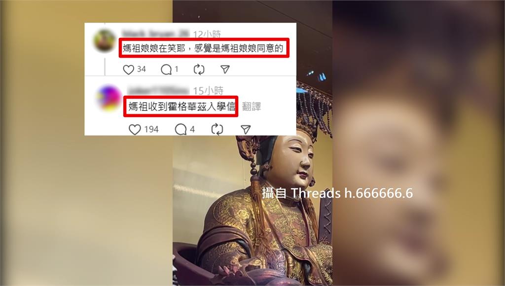 有網友笑說是媽祖收到霍格華茲入學信。圖/攝自Threads@h.666666.6勸化堂董事長黃錦源表示,「牠跟媽祖也有緣啦,應該是跟隨媽祖來修行,一方面也是一個護法。」貓頭鷹一待就是近一天,廟方也表示為了避免貓頭鷹受到干擾,因此張貼告示,暫停入內上香,相信貓頭鷹會來這,一定是有特殊因緣。