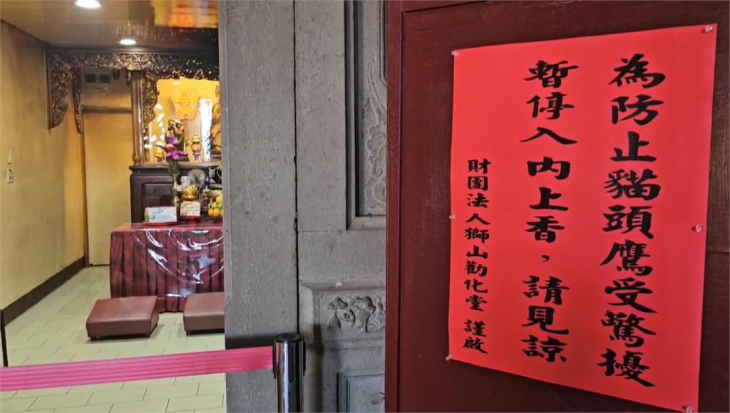 怕貓頭鷹受到干擾,廟方也張貼告示,宣布暫停入內上香。圖/台視新聞苗栗/張興傑 責任編輯/陳俊宇