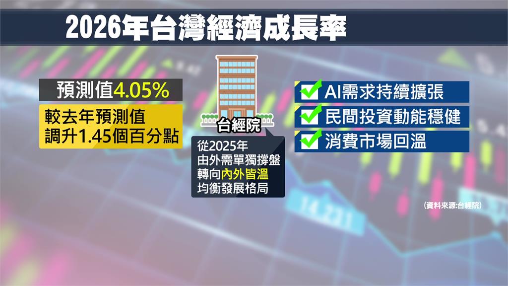 台經院公布最新整體經濟預測,因為外需、投資和民間消費表現都優於原先預期,預計2026年我國經濟成長率為4.05%,比起之前的預測值上修1.45個百分點,而國際金價也因為地緣政治風暴,導致黃金市場多頭氣勢如虹,在台北時間今(26)天清晨,國際金價首度衝破每盎司5千美元大關,刷新歷史紀錄。