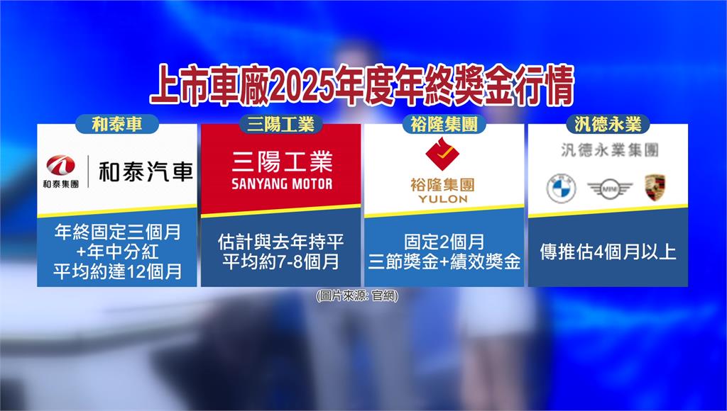 去年汽車產業面臨關稅和貨物稅的利空壓力,讓營運受到影響,但車廠還是持續發出高額年終獎金,像是車業龍頭和泰汽車年終加計紅利,預計能達到12個月,三陽工業預計將維持與前一年度持平的7到8個月年終獎金。
