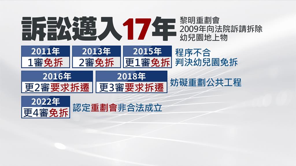 到了2022年,更四審又因重劃會被認定沒有合法成立,判決免拆,一來一往司法纏訟邁入第17年,如今更五審結果出爐,判決幼兒園拆遷,台中高分院行政庭長蔡名曜指出,重劃關係公共利益甚大,上訴人主張不應拆除黎明幼兒園,違背誠信原則並無理由,因此改判准許黎明重劃會拆除黎明幼兒園等地上物。