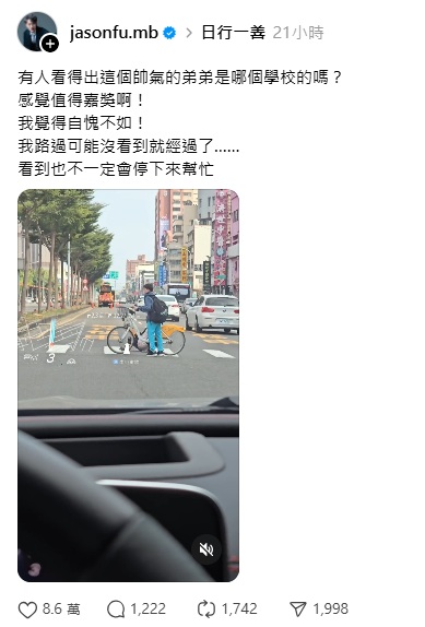 8萬網友讚國中生「腳踏車超人」。圖/翻攝自threads@jasonfu.mb