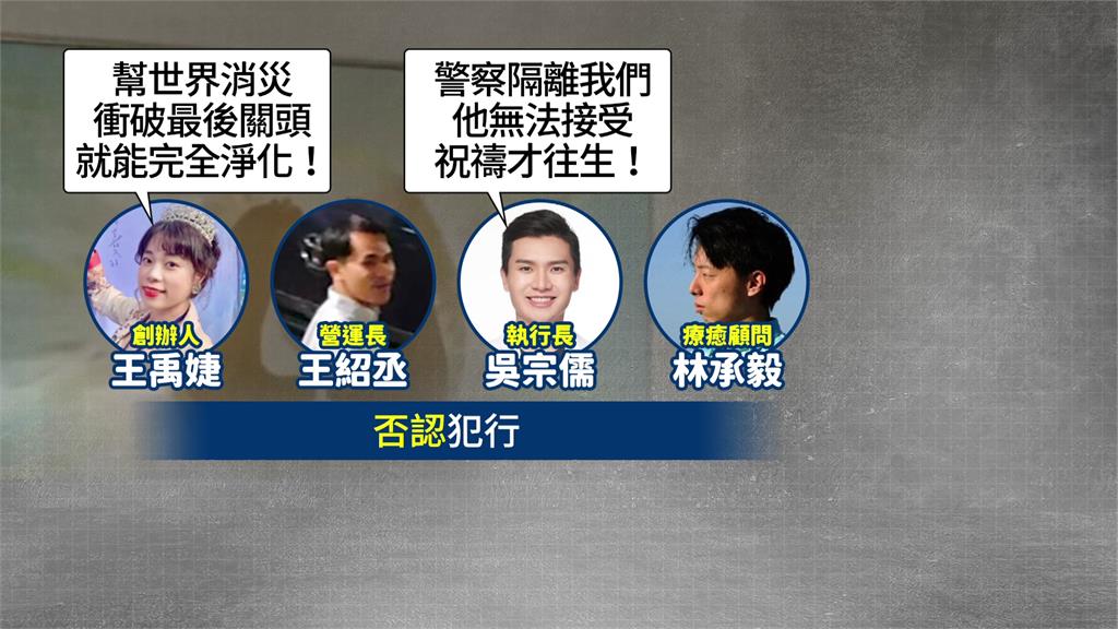 涉嫌重大的4人到案後否認犯行,王禹婕辯稱死者是在幫世界消災,吳宗儒還抱怨,警察把他們隔離在外,害林姓男子無法接受祝禱才往生。