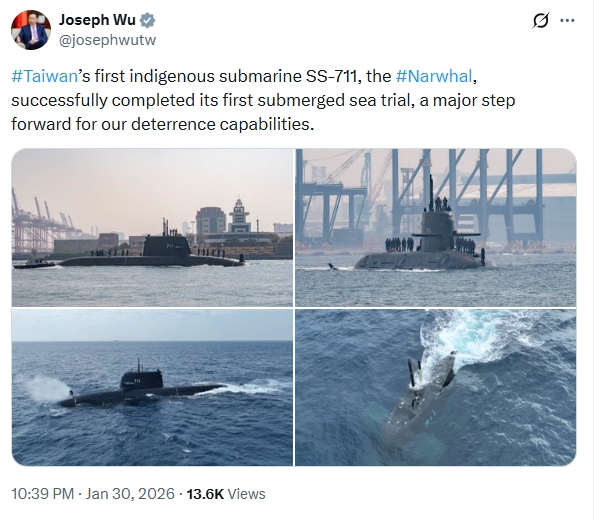 台灣國造潛艦海鯤號連續2日(29、30日)進行海測,除了完成「首次潛航測試」外,更成功達成下潛100米目標,也順利完成各項測試科目。國安會秘書長吳釗燮今(31)日在社群平台上公布空拍視角照片,指出這是台灣威懾能力向前邁出的重要一步。