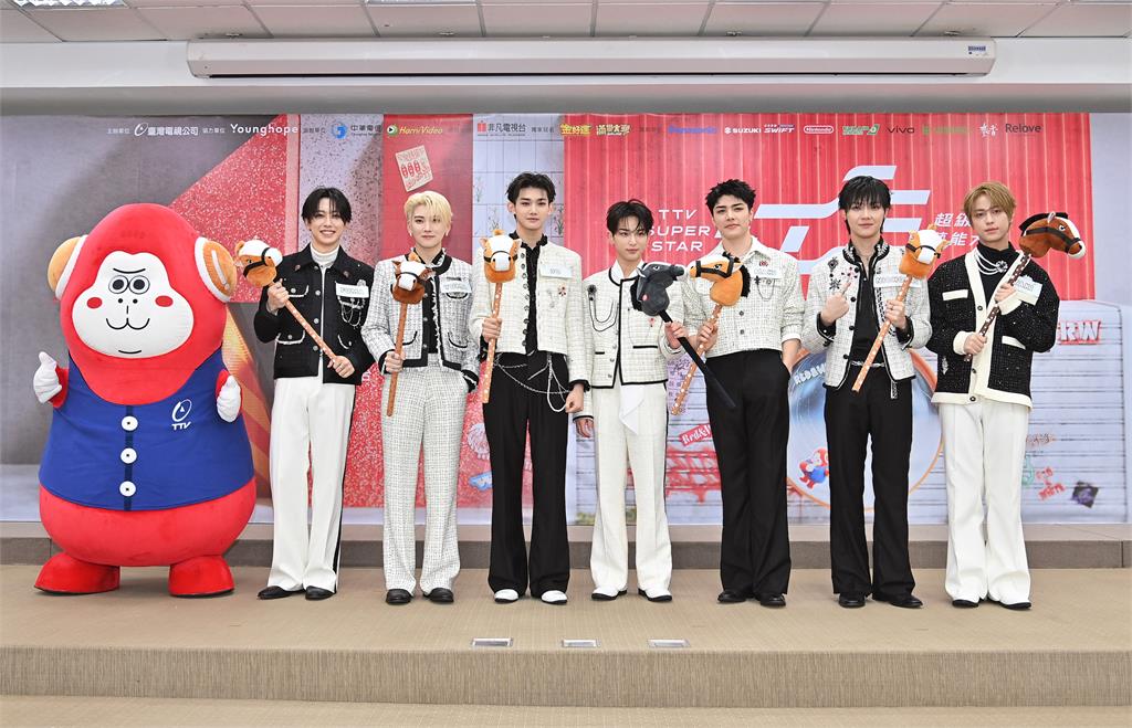 ⟪2026紅白⟫ 國際卡司者會中為〈&TEAM〉送上馬年祝福,(左)FUMA、YUMA、JO、HARUA、MAKI、NICHOLAS、TAKI。圖/台視