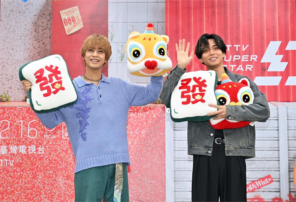 ⟪2026紅白⟫ 國際卡司記者會中為〈King&prince〉送上醒獅頭、發字可愛抱枕的祝福 。(左)高橋海人、永瀬廉。圖/台視