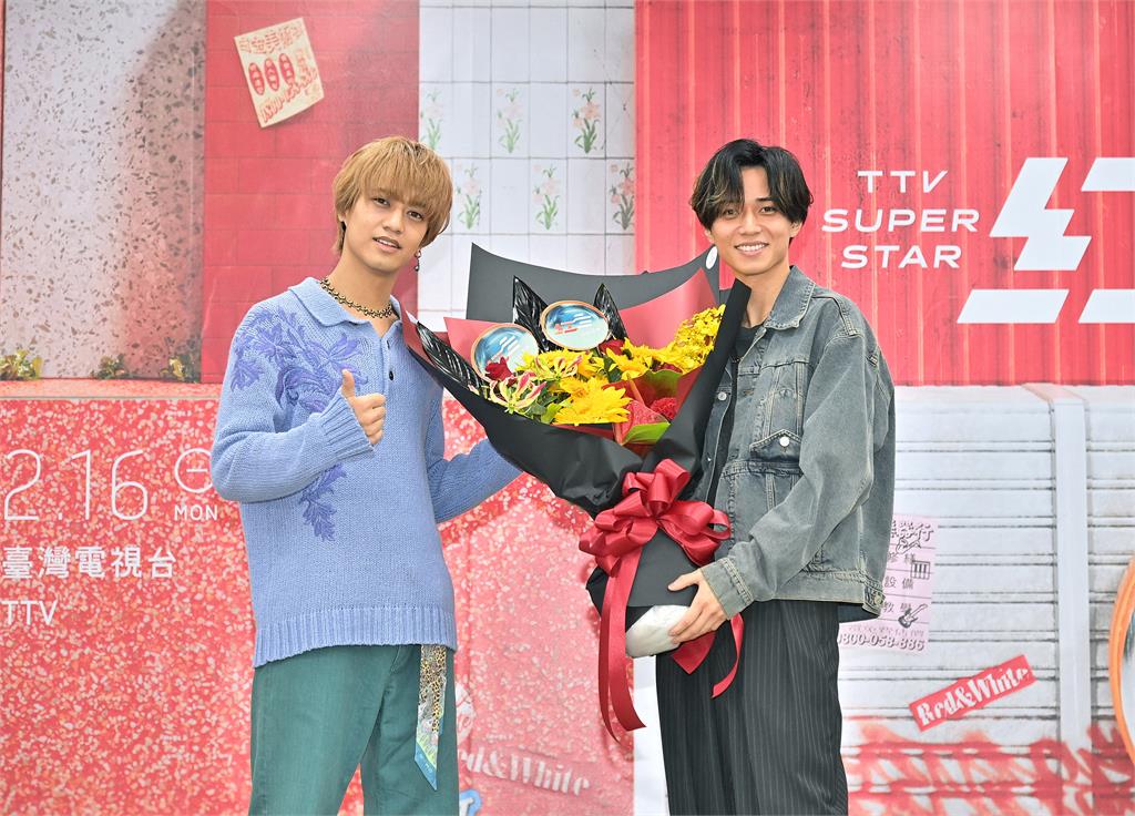 ⟪2026紅白⟫ 國際卡司記者會中為〈King&prince〉送上花束 。(左)高橋海人、永瀬廉。圖/台視