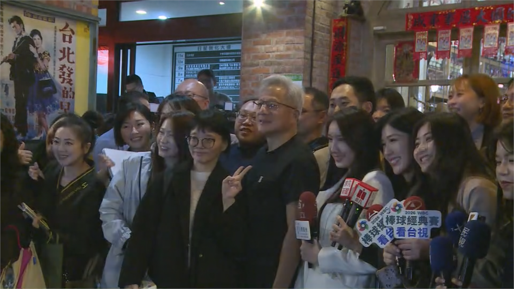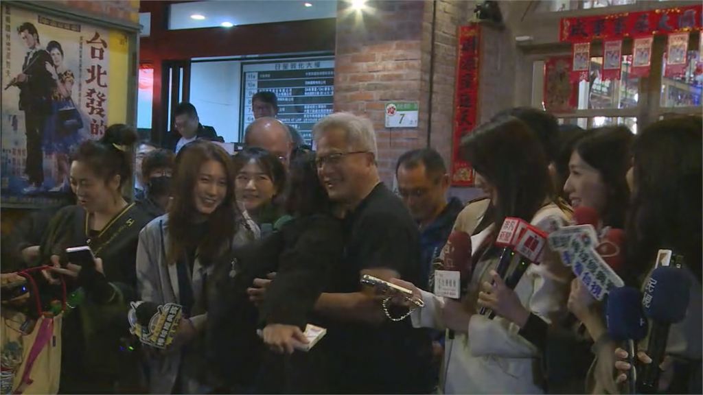 黃仁勳與記者一同於餐廳門口合影。圖/台視新聞責任編輯/蔡尚晉