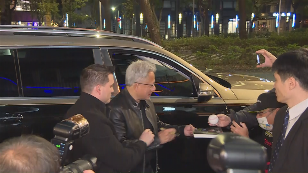 黃仁勳從黑色邁巴赫下車,身穿黑色皮衣帥氣現身。圖/台視新聞黃仁勳自備棒球,到場後首先詢問現場是否有小朋友,並當場發放簽名球,面對守候在外的熱情粉絲,黃仁勳展現親民作風,不僅來者不拒地替粉絲簽名,還有民眾為了爭取簽名機會高喊「我是里長,幫我簽名!」現場氣氛熱絡。