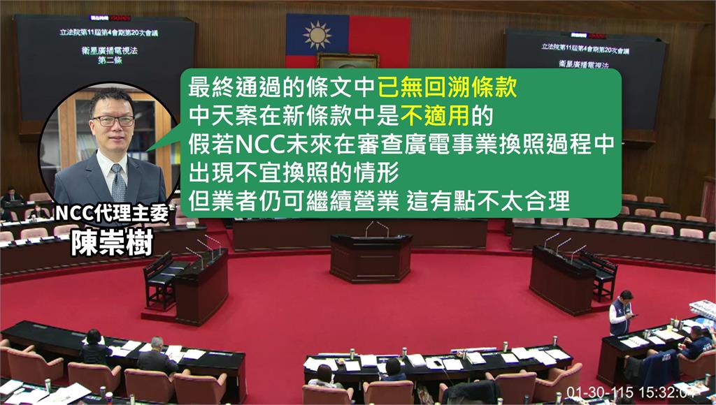 NCC代理主委陳崇樹稱通過條文無回溯條款,中天不適用。圖/台視新聞、翻攝自立院IVOD