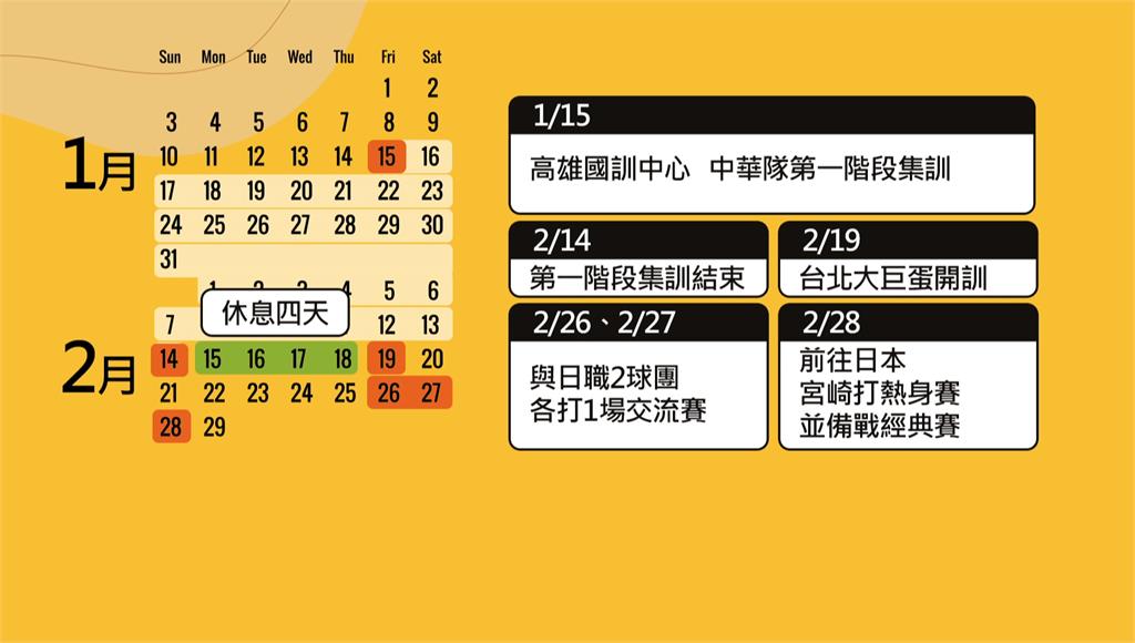 依目前規劃,中華隊第一階段集訓從1月15日一路練到2月14日,結束後各自返鄉過春節,並於大年初三(2月19日)集結台北大巨蛋展開第二階段集訓,2月26、27日與日職2球團軟銀鷹、日本火腿各打1場交流賽後,隔天就飛往日本宮崎打熱身賽及備戰經典賽。