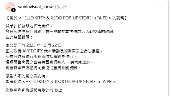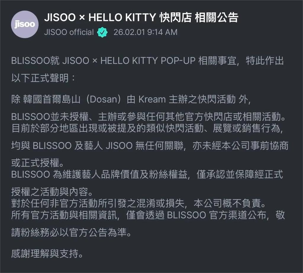 南韓天團BLACKPINK 成員Jisoo近期推出與Hello Kitty的聯名快閃店,在韓國掀起熱潮,而台灣場原訂在2月6日起於台北松山文創園區登場,但Jisoo所屬公司卻發聲明打臉,稱未授權於其他地區舉辦。台灣主辦單位與代理商緊急發聲明澄清,稱去年就拿到合法授權。